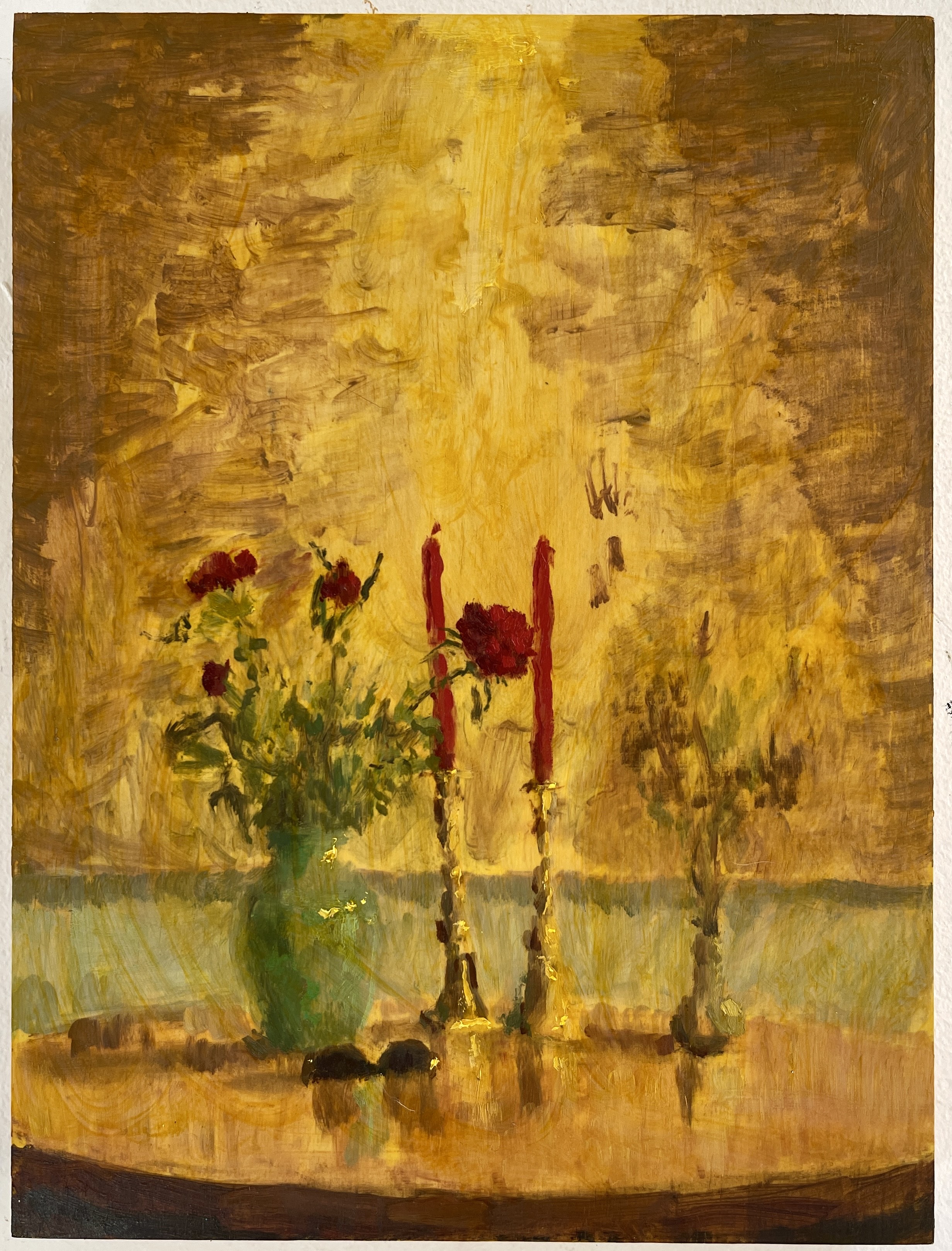 A sense of solitude and stillness is evoked through the delicate everyday scenes of Sebastian Espejo, where the overlooked and ordinary become thresholds to something else. The artist's studio becomes a starting point. Coming from the other side of the world, from Chile, it took Espejo over a year to feel comfortable with London's light. Clouds move quickly in England, and the vegetation varies dramatically according to the seasons. The artist's still lifes capture the essence of this transience through his observations of everyday scenes. The spaces he portrays seem alive with the promise of a small microcosm of life, a kind of portable sanctuary in an otherwise busy, technological world, as in "Table with Glasses & River Painting". The absence of people invites us to create our own storytelling, as if a stage has been set and awaits its drama.